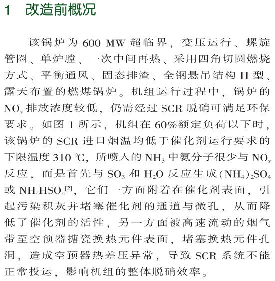 目前國內(nèi)絕大部分超(超)臨界鍋爐在低負荷運行時, SCR脫硝煙道處進口煙溫均低于煙氣脫硝系統(tǒng)運行的下限溫度,為保證催化劑的穩(wěn)定,部分電廠選擇在低負荷時不投脫硝設(shè)備,導(dǎo)致脫硝整體投運率不高。因止,解決火電廠低負荷工況下煙氣脫硝裝置人口溫度偏低、提高脫硝設(shè)備投運率的問題成為關(guān)注焦點。